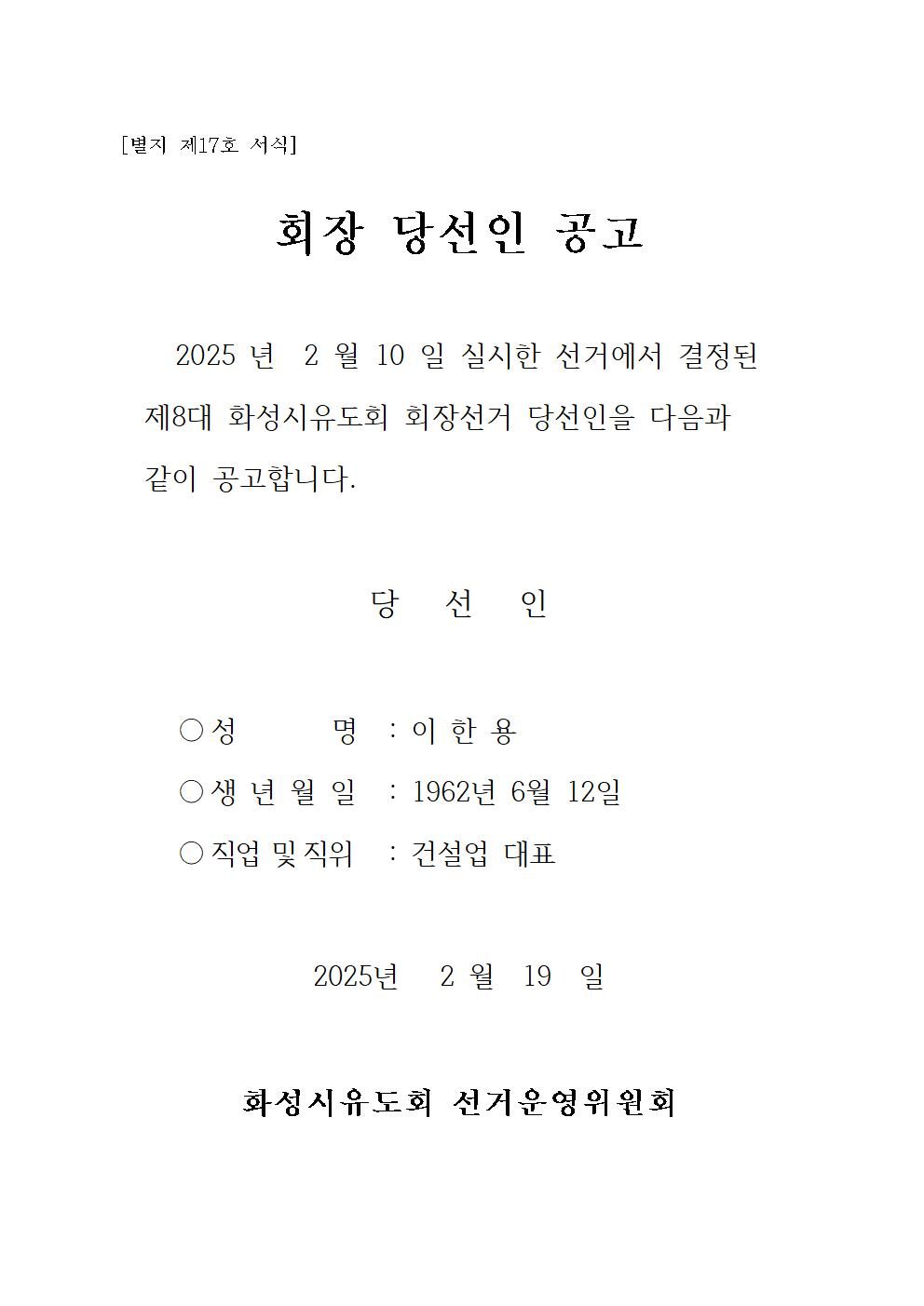 화성시유도회 회장선거 당선인 공고