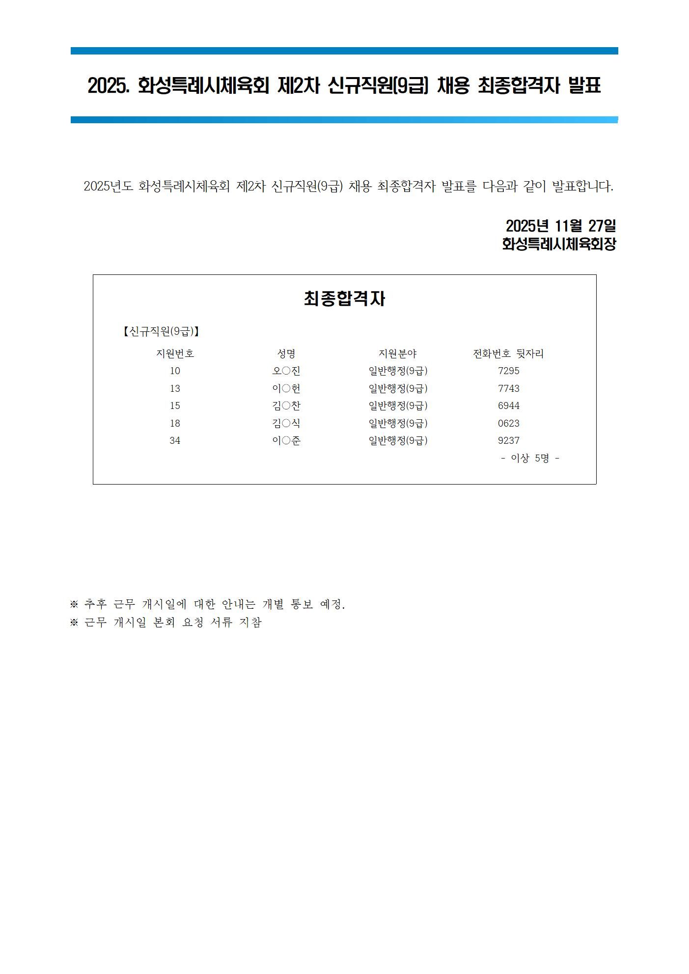 2025. 화성특례시체육회 신규직원(9급) 최종 합격자 발표
